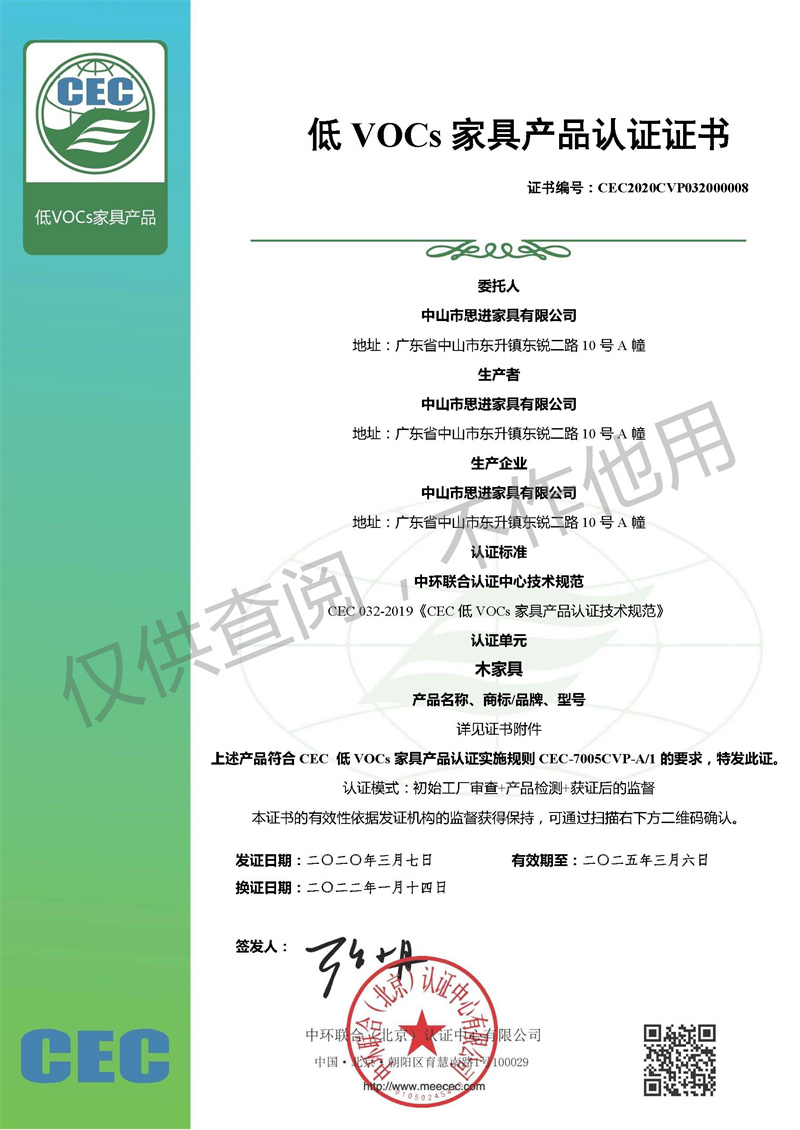 家具產品環保衛士認證證書-軟體家具
